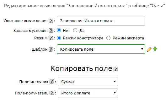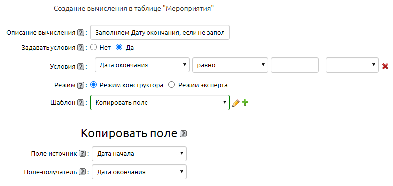Например, надо скопировать поле «Сумма» в поле «Итого к оплате». Или при добавлении мероприятия автоматически заполнять дату его окончания.