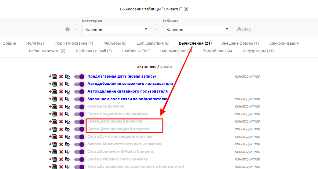 Например, необходимо записать в таблицу «Клиенты» дату первого или последнего контакта с клиентом на основании записей, внесенных в историю работы с ним.