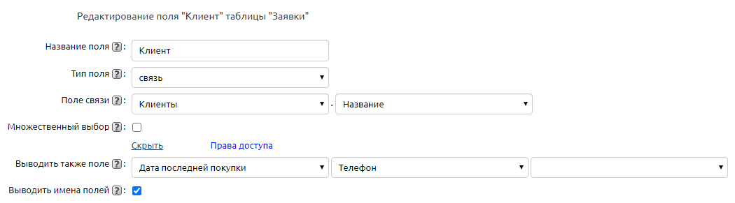 Важно! В одном поле связи можно вывести значения по нескольким полям одной записи. Эти поля задаются в настройках поля типа «связь».