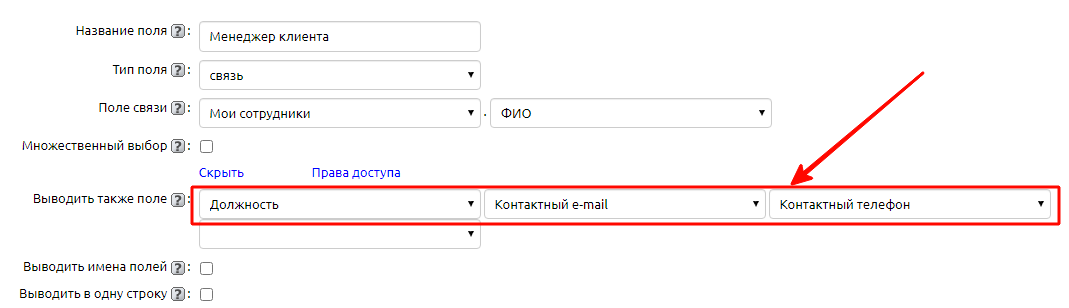 Важно! В одном поле можно вывести данные по нескольким полям одной записи. Эти поля можно задать в настройках поля типа «связь».