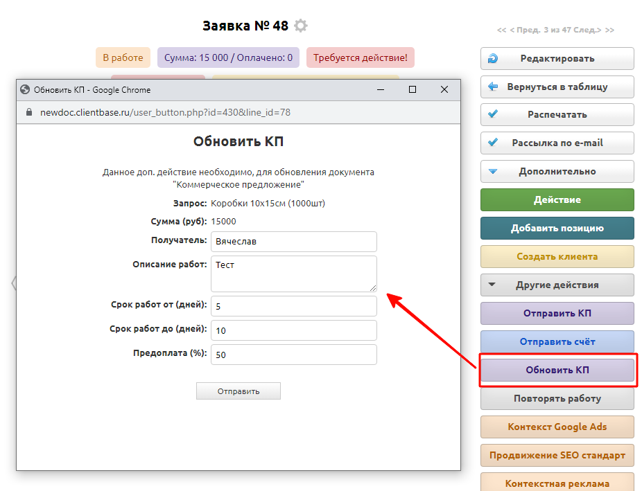 Для данной задачи в стандартной/демо конфигурации в таблице «Заявки» реализовано допдействие «Сформировать КП», а также «Обновить КП». При запуске допдействия указываются параметры, которые будут в нем использованы.